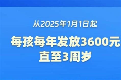 2025年9月15日 — 《方案》明确,从2025年1月1日起,对符合法律法规规定生育的3周岁以下婴幼儿发放补贴,至其年满3周岁。育儿补贴按年发放,现阶段国家基础标准为每孩每年3600元 ...